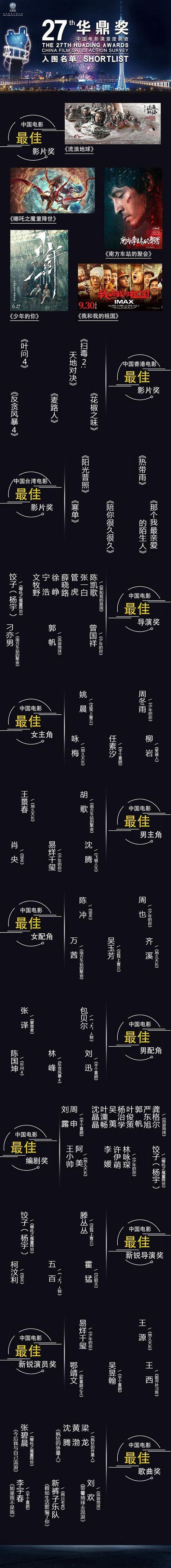 【第27届华鼎奖提名公布】随着新冠疫情在中国得到有力控制,6月11日,华鼎奖集团在澳门宣布了第27届华鼎奖“中国电影满意度调查”的12项大奖提名名单,《我和我的祖国》《流浪地球》《哪吒之魔童降世》《少年的你》《南方车站的聚会》5部类型和题材迥异的影片入围最佳影片,陈凯歌、郭帆、饺子(杨宇)等导演获得最佳导演提名,王景春、胡歌、肖央、沈腾和易烊千玺竞争最佳男主角,咏梅、周冬雨、姚晨、任素汐和柳岩角逐最佳女主角。