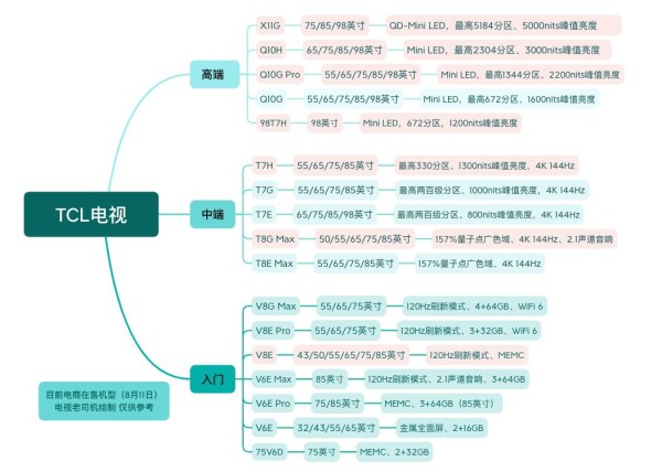 为了更好的帮助大家选购,我们专门整理了TCL所有线上型号,通过自制的思维导图可以更直观的了解。下面图片基本涵盖了在售的所有机型,具体推荐型号产品信息后面会有单独的介绍。