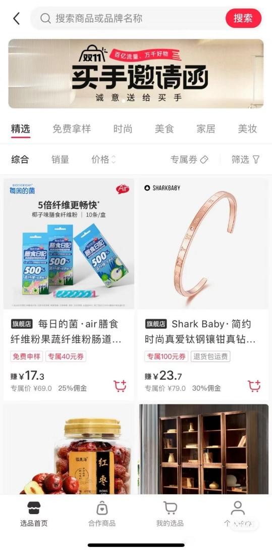 买手可以在选品中心自由选择商品,筛选后平台会显示售价和佣金,只要用户通过购买链接完成销售即可获得佣金。