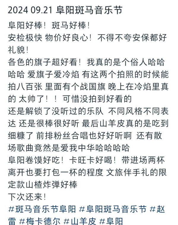 这场演唱会的圆满落幕,离不开阜阳各部门的共同努力和坚守,包括文旅、公安、城管、交通、卫生、应急、气象、通信等部门,他们通力合作,确保了音乐节的顺利进行。许多乐迷在社交平台上表达了对阜阳的赞赏和期待再次来访的愿望。