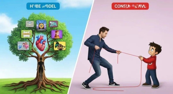 而HYBE做的是“共生型”**——艺人从出道第一天起,他的人设、歌词、MV就是为那个长线的Webtoon故事服务的。