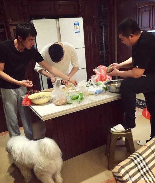 餐厅的装饰就比较沉稳了。整套橱柜再加上门,全部都是用红棕色的原木材料制成。多了一丝古典的气息。大大的双开门冰箱,好像是经常会在家做饭的样子。图中林更新正在跟他的朋友一起准备晚餐。桌上食材非常丰富,看他动作也很娴熟,应该是经常在家做饭。