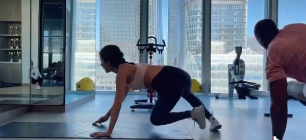 杨采钰做出了不少高难度的动作,她以单手和单脚撑地带动身体转向,这个动作十分考验腰部力量,杨采钰仍能轻松完成,姿势专业,与一旁的私教水平不相上下。