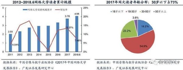 2017-2018H网络文学用户规模从3.78亿人增至4.06亿人。18~30岁人群是主要用户群体占比54.9%;一线、二线、三线及以下城镇(包括农村)占比分别为20.3%、24.7%、55%。2017年网络文学读者日均阅读时长达73.4分钟,同比增长9.6%,且仍在持续增长。