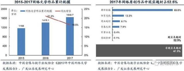根据阅文招股书和Frost&Sullivan数据,2013-2016年移动端付费率由3.3%提升至7.0%,PC端付费率由1.3%提升至2.0%,并预计于2020年移动端、PC端付费率分别有望提升至14.5%、4.8%。根据《2017年中国网络文学发展报告》,2017新增网络文学作品234万部,总达1,649万部,其中现实类题材、非现实类题材分别占比52.5%、47.5%。