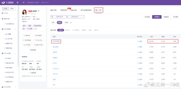 从下图中我们发现,近一个月,赵露思为SK2、摇滚动物园、芭比布朗、祖玛珑等9个品牌发布了商业笔记,以护肤类产品居多,均获得很高的笔记声量,其中声量排名第一的是摇滚动物园,我们以此为例进行分析。