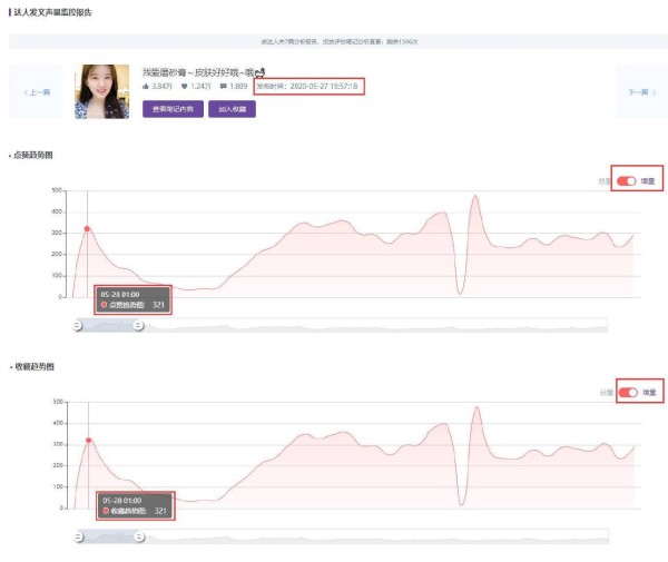 我们通过对该条视频进行分钟级的声量监控后发现,在赵露思发布视频后仅六小时,该视频的点赞和收藏增量就达到了第一个峰值321。