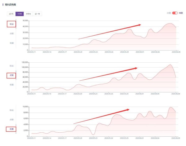 其实,赵露思能获得这样漂亮的带货成绩也是一种必然,我们从她近一个月的增长趋势图中就可以发现,从5月20日开始,其粉丝、点赞、收藏增量就明显呈现出波动式上升的状态。