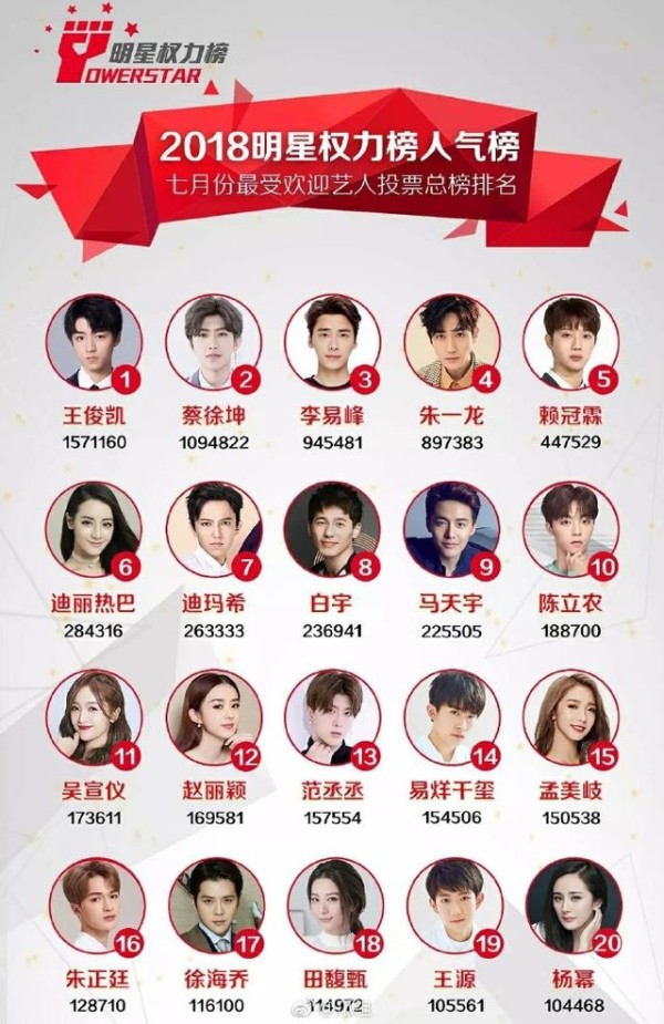 明星人气榜排名,蔡徐坤李易峰上榜,鹿晗落选,王俊凯成最大赢家明星权力榜华语男歌手TOP10,蔡徐坤9连冠,鹿晗排名让人意外
