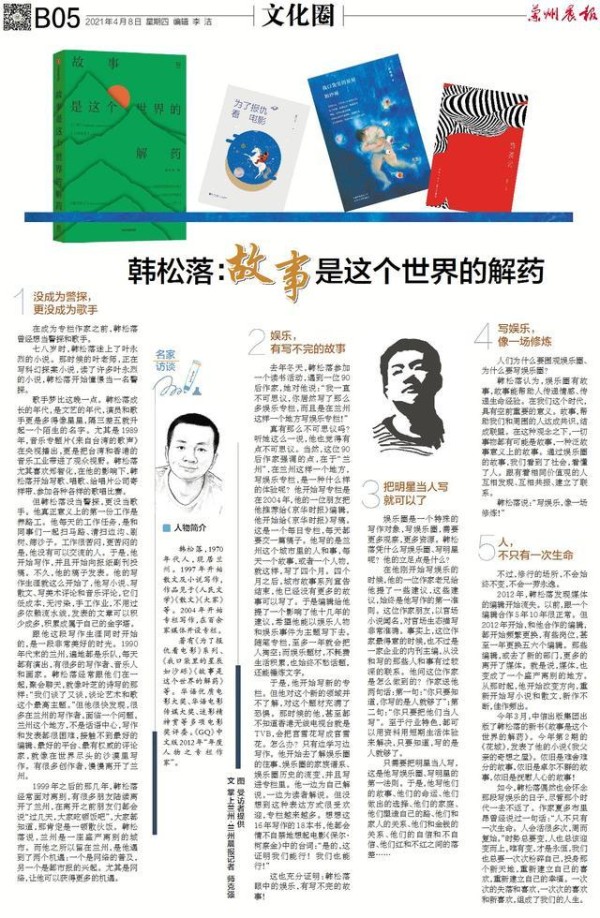 去年冬天,韩松落参加一个读书活动,遇到一位90后作家,她对他说:“我一直不可思议,你居然写了那么多娱乐专栏,而且是在兰州这样一个地方写娱乐专栏!”
