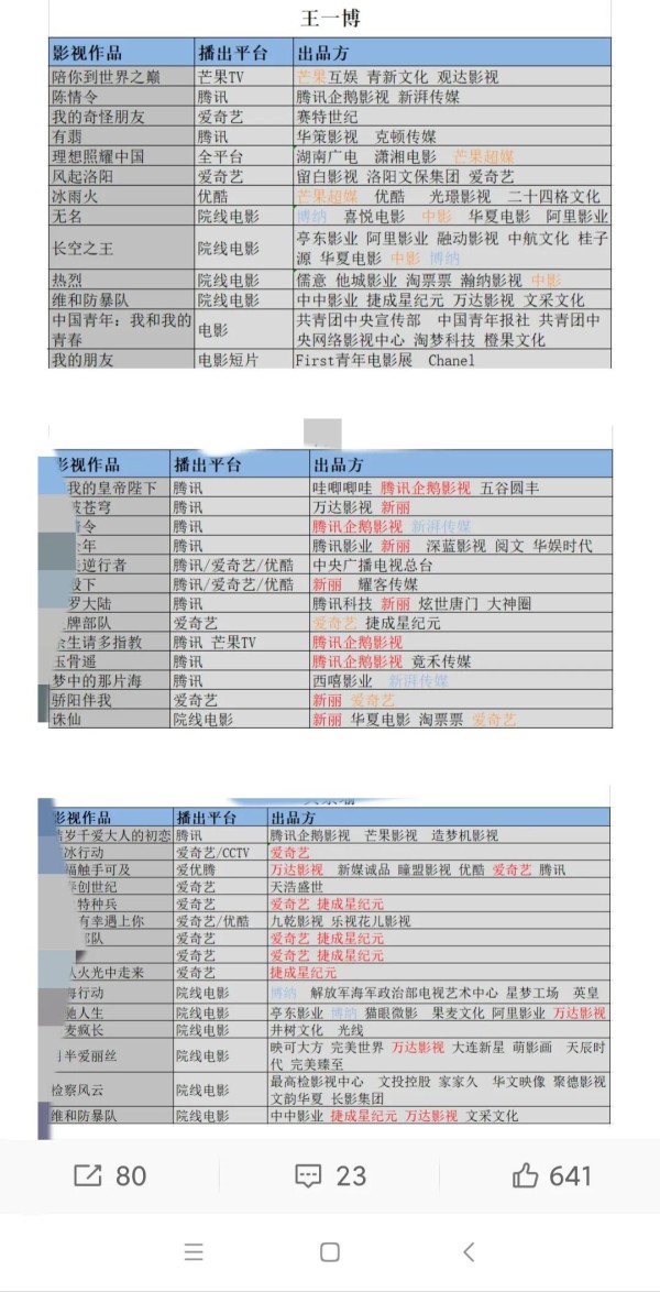 把王一博参演电视剧和电影拉一个表格,会发现,基本上没有重复的投资方和班底。