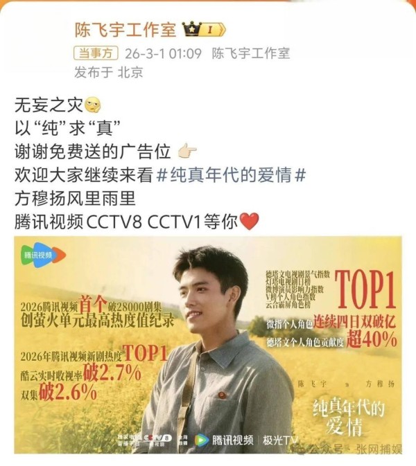 2026年3月1日凌晨1点09分,星二代陈飞宇突然在社交平台高调发文,短短四句话瞬间引爆热搜。工作室以“无妄之灾”定性网络传闻,用“以‘纯’求‘真’”双关新剧《纯真年代的爱情》,最后还不忘调侃“谢谢免费送的广告位”。这场看似随性的深夜发声,却成就了一场教科书级的危机公关胜利。