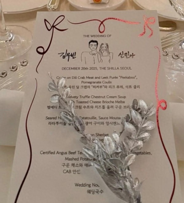 婚礼的请柬也别具心意,采用简笔画加手写字的形式,标注画作出自申敏儿、文字由金宇彬书写。 这种亲手打造的心意同样体现在婚礼菜单上,融合了申敏儿的插画与金宇彬的手写字体。