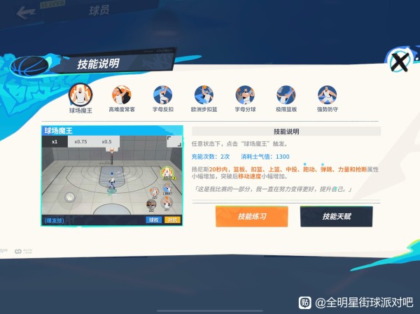 不仅可以增加被传球人的命中率,最重要是能骗跳骗都。很对人防守看见字母哥要扣就会想帽,队后就会及时跑出空位。所以在防守字母哥时,安心交给中锋吧,人盯人。且这技能还能骗韩旭豆和卡佩拉大招。一次骗不了多骗几次。骗到就是赚到球场魔王1300士气值,带来20秒内的篮板,扣篮,上篮,中投,跑动,弹跳,力量,抢断的全面增幅