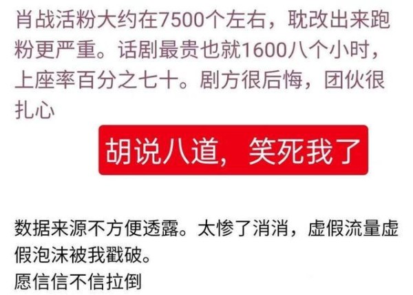 因为居然有人回答:“肖战的活粉大约在7500人左右,《如梦之梦》的上座率只有70%,剧方很后悔,团伙很扎心。”
