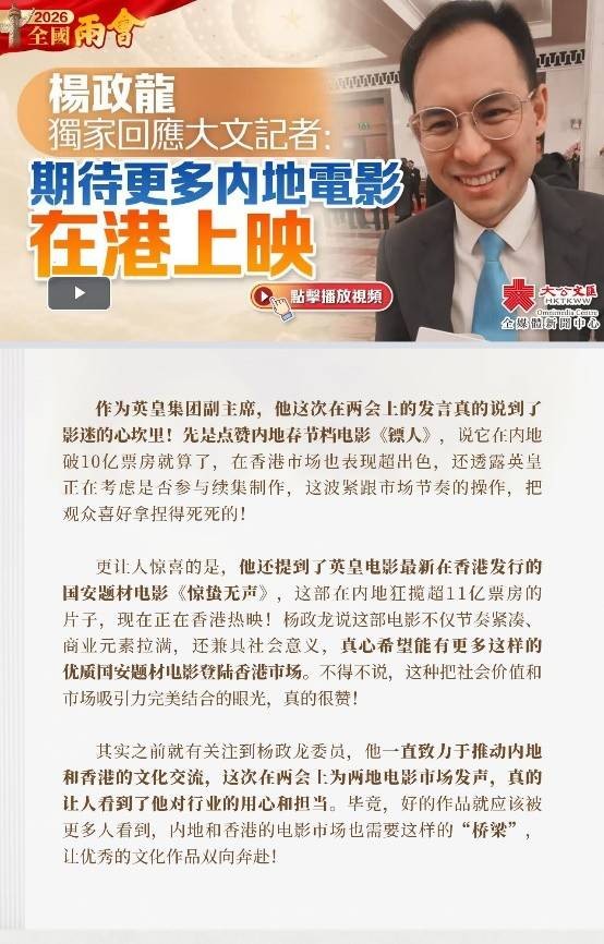 在全国两会召开期间,多位政协委员围绕国产电影高质量发展与中华文化出海等议题建言献策。港区委员、英皇集团副主席杨政龙结合《镖人》《惊蛰无声》等影片的市场表现,分享了对国产电影发展的见解。他表示,英皇长期深耕影视创作,推出多部爱国主题电影,在海外市场取得良好票房,并获得海外华人及外国观众认可,切实做到了以电影为桥,推动中国文化走向世界。