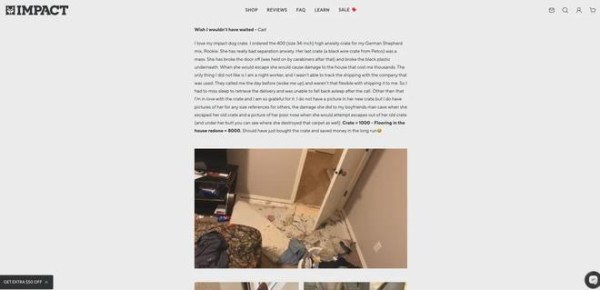 不仅如此,这篇文章最大的亮点在于引入了海量的真实用户评价与实拍图。品牌特意选取了用户关于“我家狗以前拆坏过三个笼子,直到换了 Impact”或“在车祸中笼子保住了狗狗性命”的真实反馈。