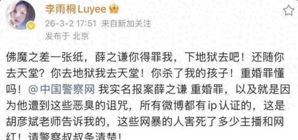 事情的来龙去脉倒不算绕。三月二号晚上,李雨桐连发几条微博,正面刚薛之谦,说他有重婚问题,说他粉丝老年累月在网上围攻她,搞得她精神压力极大,身体都受影响。她还让薛之谦把“手表西装”这两个物件归还。有网友不懂,问怎么又出来锤人了,李雨桐轻描淡写回复一句“时机到了”。可是“时机”什么时候算到位,可能连她自己都没说清楚。她那堆料发出来本来也乱七八糟,没逻辑,讲得七零八落,很多人其实看了就过,没怎么走心。薛之谦态度倒是挺硬,经纪公司第二天立马声明打脸,说重婚纯属无中生有。