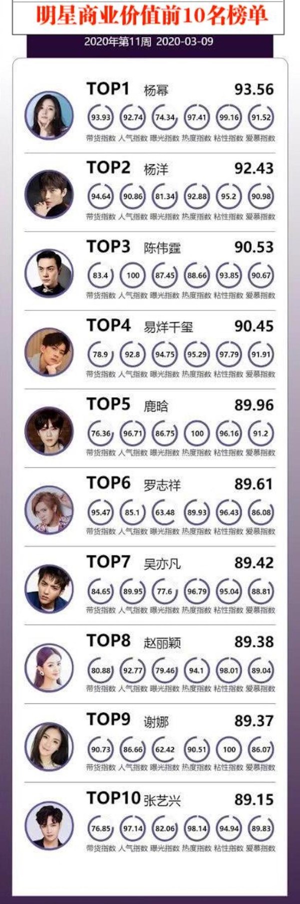 艺人商业价值榜TOP10:鹿晗第1,杨幂不如热巴,TFBOYS全员上榜!