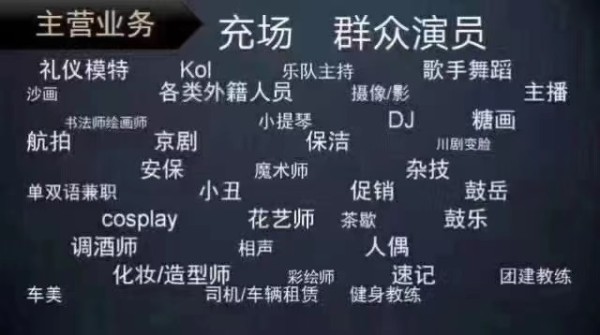 外籍类:舞蹈、乐队、管弦乐、比基尼DJ、小提琴、模特礼仪、杂技、水晶球、花式调酒、歌手、魔术小丑