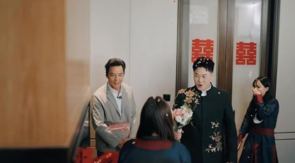 最戏剧性的一幕发生在堵门环节。当伴打开门,准备“为难”一下新郎时,门外站着的竟然是巨星吴彦祖本人!现场瞬间被惊喜的尖叫声淹没。接下来的画风更是毫无明星包袱:吴彦祖直接趴在地上,认真帮新郎寻找被藏起的婚鞋,并成功完成任务;代旭头戴喜庆的小红帽,忙着分发饮品,化身气氛组组长;井胧则用手机记录下这难忘的一切。三人还真诚地为新人送上了“一见倾心”等祝福,堪称“一条龙”沉浸式助婚。