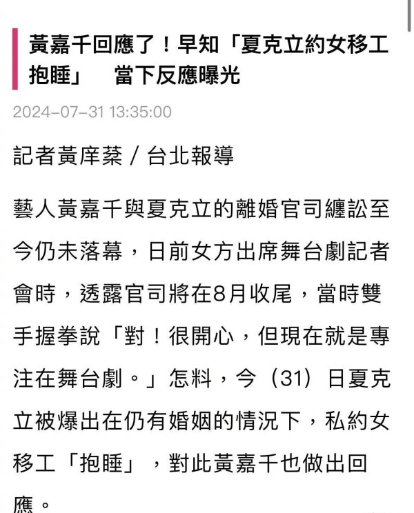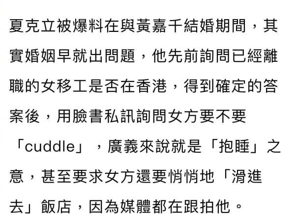 在这个追星狂热的时代,娱乐圈的负面新闻不断冲击着我们的视野。每当一位明星卷入丑闻,无数好奇的眼球都会被吸引过去,社交网络也随之沸腾。夏克立与黄嘉千的婚姻问题就成为了热门话题。据报道,夏克立在与妻子结婚期间曾私信一名女移工,试图邀请对方"抱睡",甚至要求对方偷偷进入饭店躲避媒体。对此,黄嘉千表示知晓此事,并坦言当时的心情是"很气很难过"。这无疑是一件令人不齿的事情,但如果我们深挖下去,就会发现其中隐含着更多值得思考的问题。