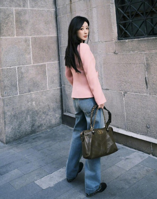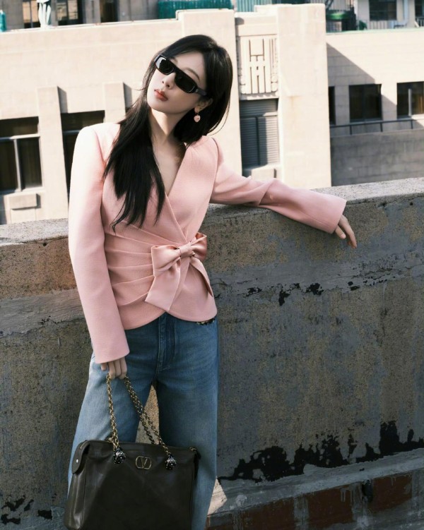 这组出发图中,杨紫以粉色V领收腰蝴蝶结西装+直筒牛仔裤的组合亮相,精准平衡了春日温柔与都市利落感: