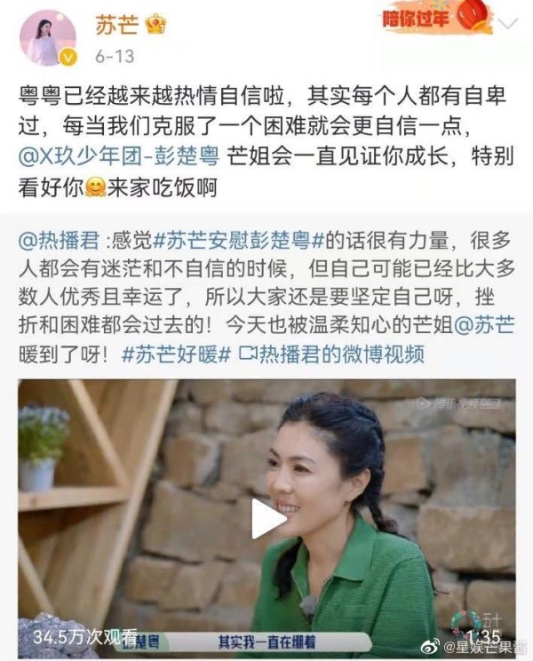 而在《五十公里桃花坞》中,苏芒更是一度成为了能细腻照顾他人情绪、积极勤劳建设桃花坞的“穿着围裙的邻家姐姐”。虽然带有些调侃意味,却也一下就把苏芒从“光芒之外”拉入了“平常烟火气”中。原来,苏芒也只是一个弟弟妹妹眼中亲切且富有人情味、擅于安慰治愈别人的好姐姐。