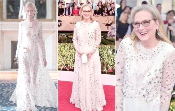 梅丽尔·斯特里普穿着瓦伦蒂诺在SAG颁奖礼上展现出的风采,与穿着瓦伦蒂诺的模特所带给我们的感觉截然不同。两者各有千秋,难以分出高低,只能说风格迥异而已。斯特里普在SAG颁奖礼上以不同于模特的风格展现了瓦伦蒂诺服装的魅力,彰显出她独特的风采。