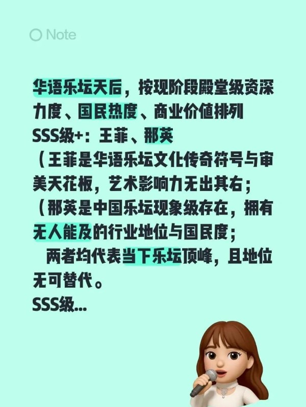 在华语乐坛这片浩瀚的星空下,天后们以其独特的魅力与深厚的功底,铸就了无数传奇。今天,我们就来盘点一下,按照现阶段的殿堂级资深力度、国民热度及商业价值,华语乐坛天后们的排名如何。