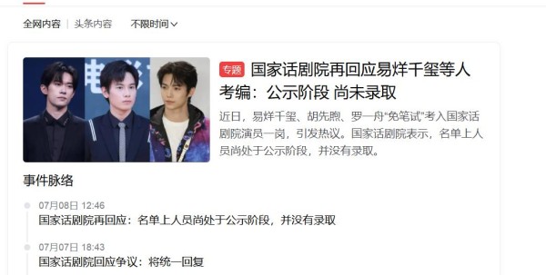 本来大家欣赏的就是易烊千玺的演技,但是不知道怎么回事,都被考编带偏了,近日国家话剧院的回复是,还没有正式宣布,没有录取,只是公示阶段而已,而易烊千玺这边,也没有回应什么,从始至终,易烊千玺都保持沉默,从没有对风波说过任何一个字以及对他父亲的传闻!