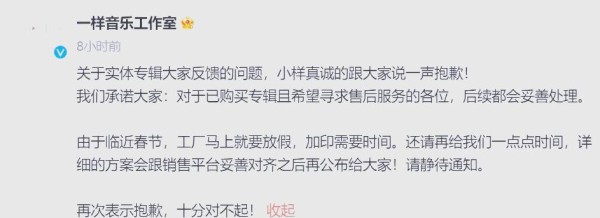 紧接着,一样音乐工作室也发表声明致歉,并透露将公布具体的售后解决方案。
