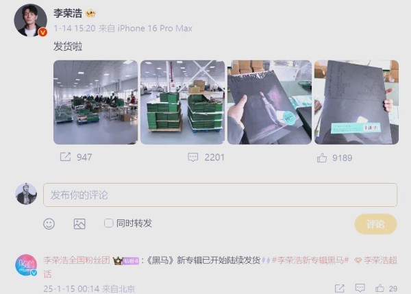1月14日消息,李荣浩在社交媒体上分享了新专辑的工厂发货照片,同时,李荣浩的全国粉丝团也宣布,《黑马》新专辑已开始陆续发货至全国各地。