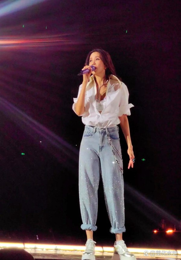 白衬衫的衣角被舞台风扇轻轻掀起,牛仔裤包裹着紧实的腿线,莫文蔚握着荧光棒从追光中走来时,台下坐着的五千个中年男人突然集体陷入了沉默。