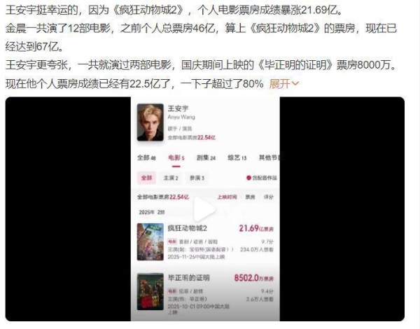 要说的话,如果自己喜欢的明星为电影配音,粉丝们一定会全力支持,就像他们喜欢看到明星主演的作品一样。除了配音引发的争议之外,王安宇和金晨还直接从《疯狂动物城2》中分得了不少红利。因为这部片子,王安宇的个人票房总额上涨了21.69亿,而金晨的数字也达到了67亿。