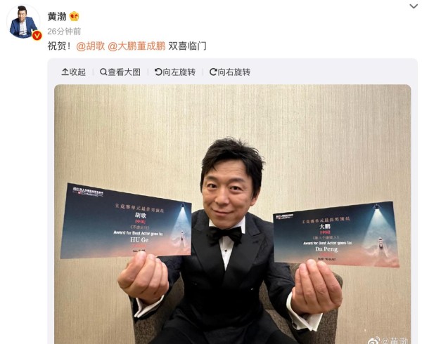 很快,和大鹏一起合作了浙产电影《热烈》的黄渤也发博送上祝贺,说这是双喜临门。