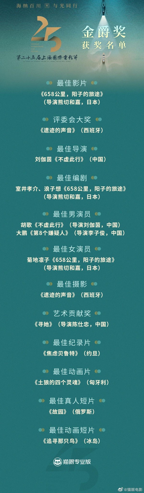 第25届上影节金爵奖获奖名单:胡歌大鹏获最佳男演员