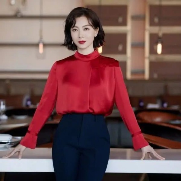 小高领款的缎面材质衬衫,还是比较抢眼的酒红色,陈数穿上这件衬衫之后,明显在气质方面提升了不少,气场也是十足呀,搭配藏蓝色的西裤,女强人范儿随之而来,好知性优雅!
