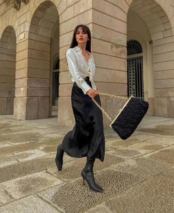 本来缎面衬衫穿上身就已经很有气质,很高级感觉了,在下装的时候搭配同样材质的半裙之后,会把你的造型档次感瞬间提升,更加的优雅迷人,随意拎着一个精致的包包逛街,让人看到的就是一位自信光芒四射的女性!