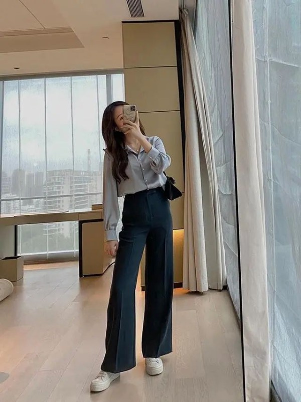 缎面衬衫本来就是垂感很好的材质,搭配雪纺的阔腿裤,这两种的材质比较相似,组合在一起之后,就得到了很完美的契合,穿上凉快又时髦,还能突显出你优雅女人味的一面!