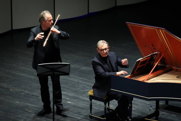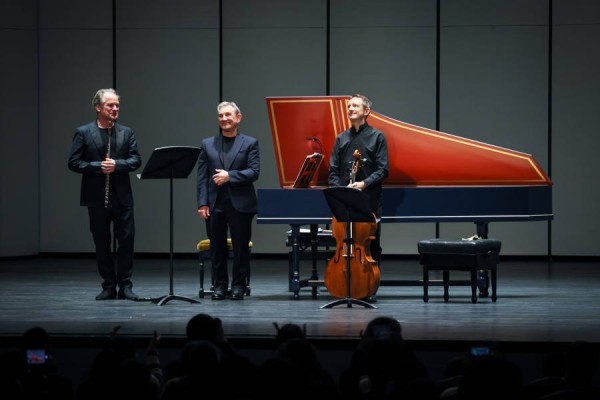 三位大师在演出前分享了各自音乐的细腻理解。“在舞台上的时候,我会聆听另外两位演奏家在弹奏什么,这永远是一种乐趣,也是永远是一种挑战”,平诺克回应他们音乐合作中的火花,“演出中的两首奏鸣曲,巴赫只写了低音贝斯部分,表演时的那些和弦包括装饰音都要即兴演奏起来。”大提琴家曼森几乎在现场上起了巴洛克乐器“大师课”:表演巴洛克音乐的提琴是在羊肠弦上演奏的,羊肠弦一直用到20世纪中叶,现在才有这些金属弦;羊肠弦是非常的温暖明亮的一种音色;由于乐器技术更原始,它对这个技术的要求也非常高,所以在音准与弦的控制上需要小心去调,尽管可能不够完美,但其中的美感令他满意。而帕胡德的观念更为现代化。他的长笛则是重新购置的乐器,跟巴洛克竖笛结构稍微有不一样,但是它的声效结构也是适应以前的这些古老的音乐。