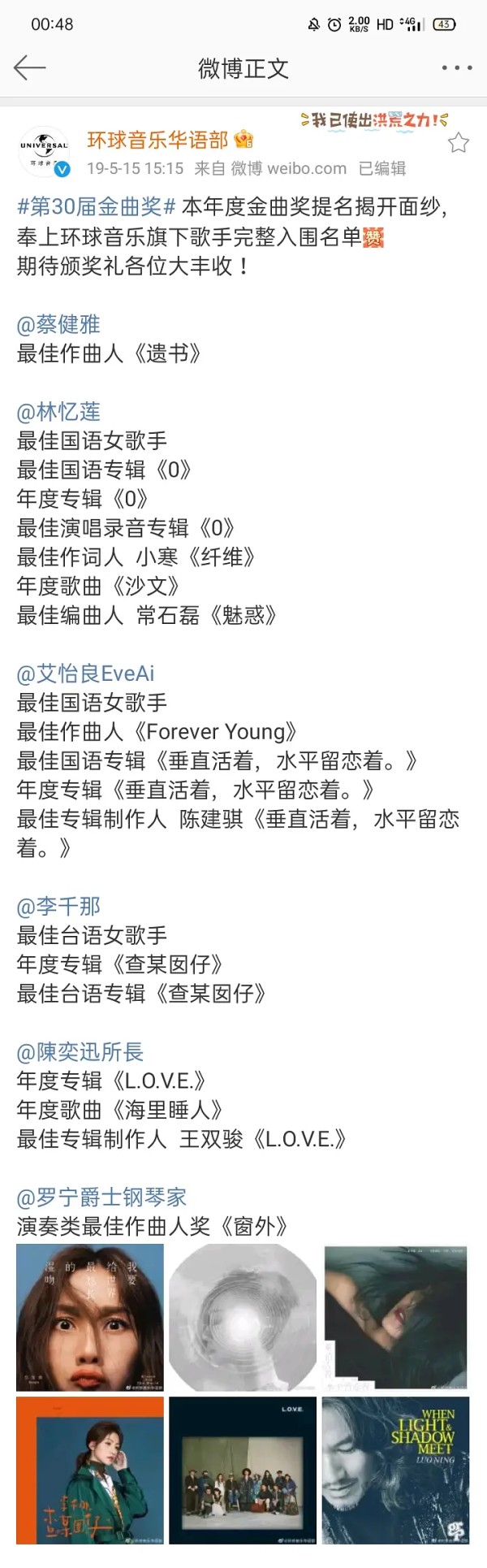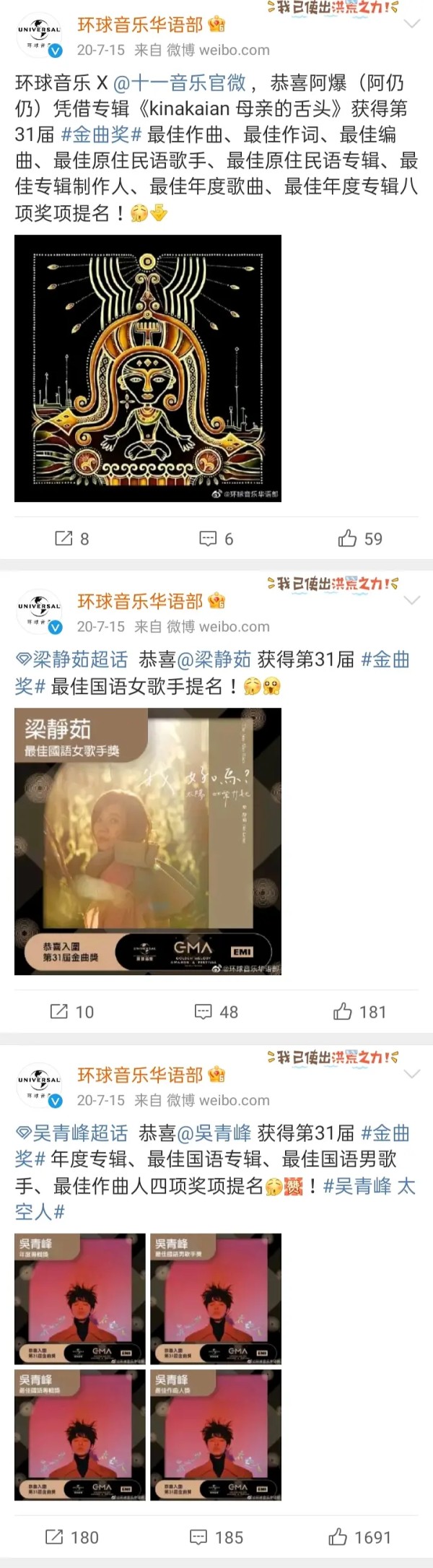 网址:搜索环球唱片华语部微博-专辑,三年间发专辑的知名歌手真的很少,频率过低.....三年30+ https://mxgxt.com/news/view/2049461