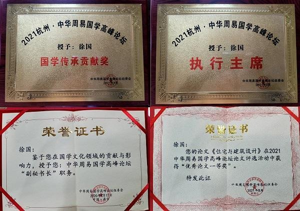 2021年8月杭州·中华周易国学高峰论坛,授予执行主席和国学传承贡献奖;