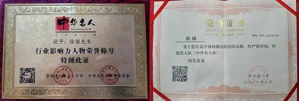 8月24日入编中华名人库,授予“行业影响力人物荣誉称号”。