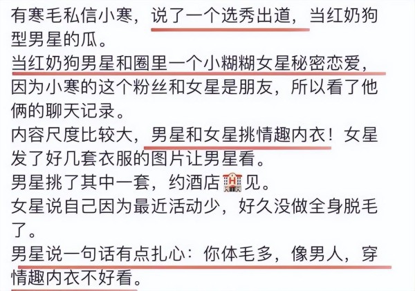 现如今普通恋情瓜已经不能满足网友了,开始挖掘一些重口劲爆瓜,日前,知名狗仔张小寒曝光某三字男流量私下谈恋爱,而且还让女友刮体毛,穿情趣内衣,且不说这位三字男星是不是真的当红流量,单说这个瓜就让网友直呼大尺度。