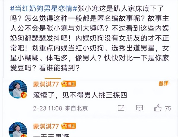 根据张小寒的爆料,三字男星是通过选秀出道的,粉丝眼中的小奶狗,但已经交往了一个圈内女友,女友名气不如他,基本就是娱乐圈查无此人的糊咖,张小寒的某位粉丝正是这位女星的好友,女星和好友分享了和三字男星的聊天记录,兜兜转转这个瓜就到了张小寒手中。