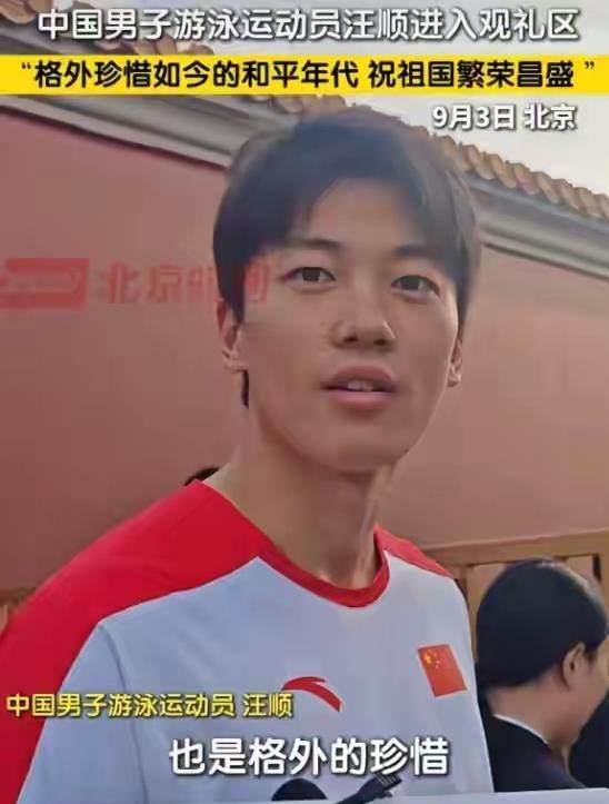 游泳运动员汪顺在接受采访时表示:“能够生在和平的年代,我们每个人都应该珍惜这来之不易的和平环境。