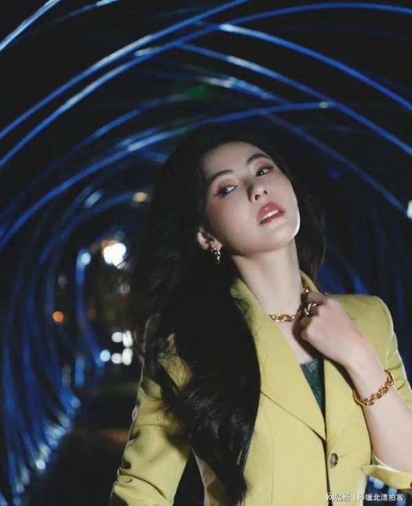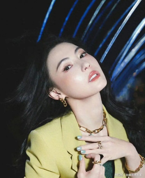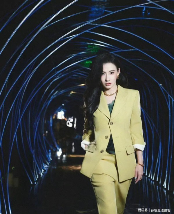 她高折叠度的面部结构中和了金饰厚重感,鹅黄色西装套装与金链呼应,弱化俗气,尽显飒爽摩登。