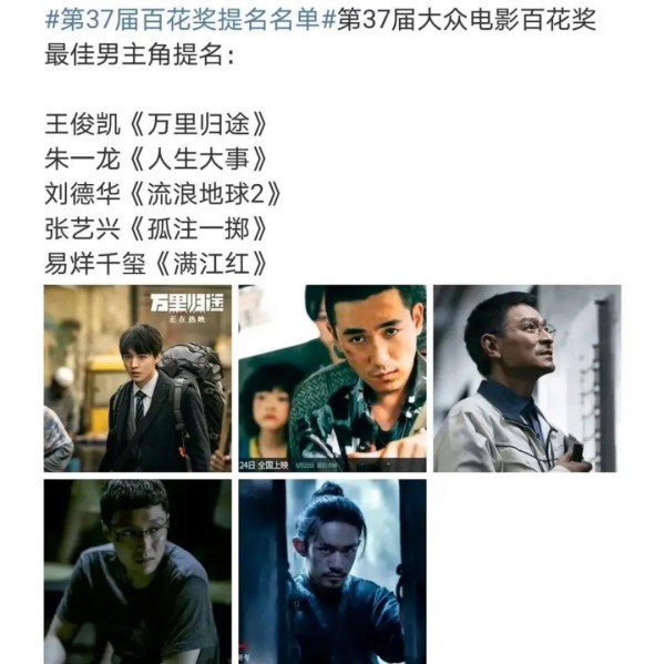 第37届大众电影百花奖公布提名名单,刘德华朱一龙提名最佳男主角
