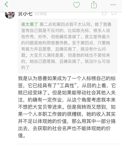 “一码归一码”的前提,仍然是慈善不能作为洗白/挡刀工具,不能在比如我们说大宝贝演技太差多多提升时,粉丝来辩解一句“她做了很多慈善”